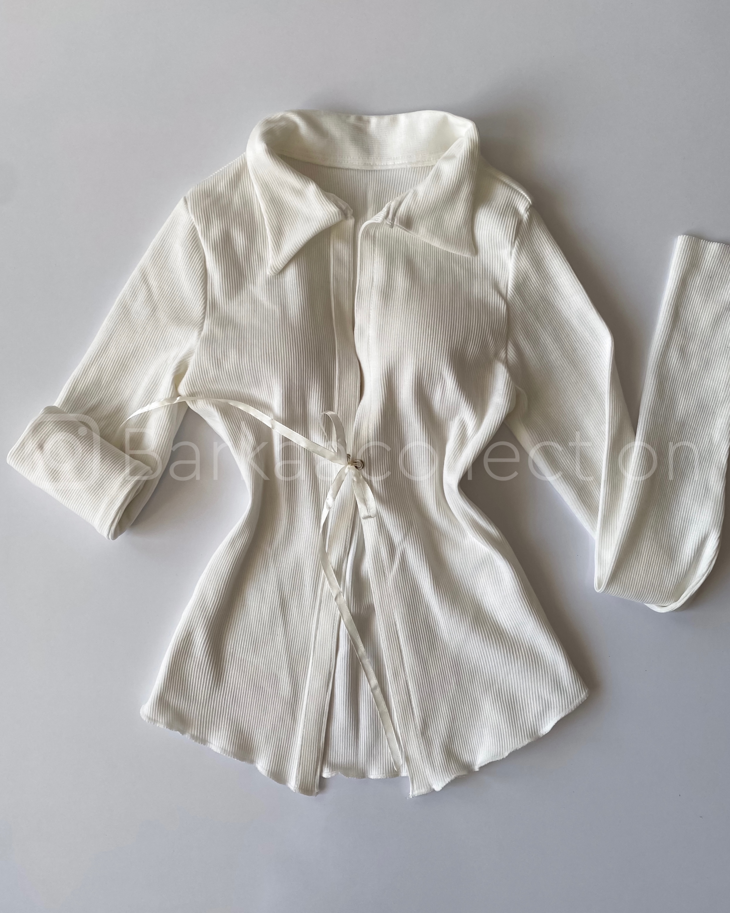جلو بلوز باز هست و با روبان قابل تنظیم